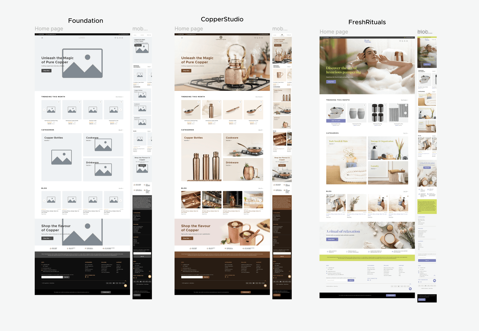 The design system was first implemented in the CopperStudio website redesign, bringing a refined and cohesive digital presence to the premium kitchenware brand. Later, it was reused for Fresh Rituals, a bath & body label, where the same system took on a lighter, more playful visual tone.